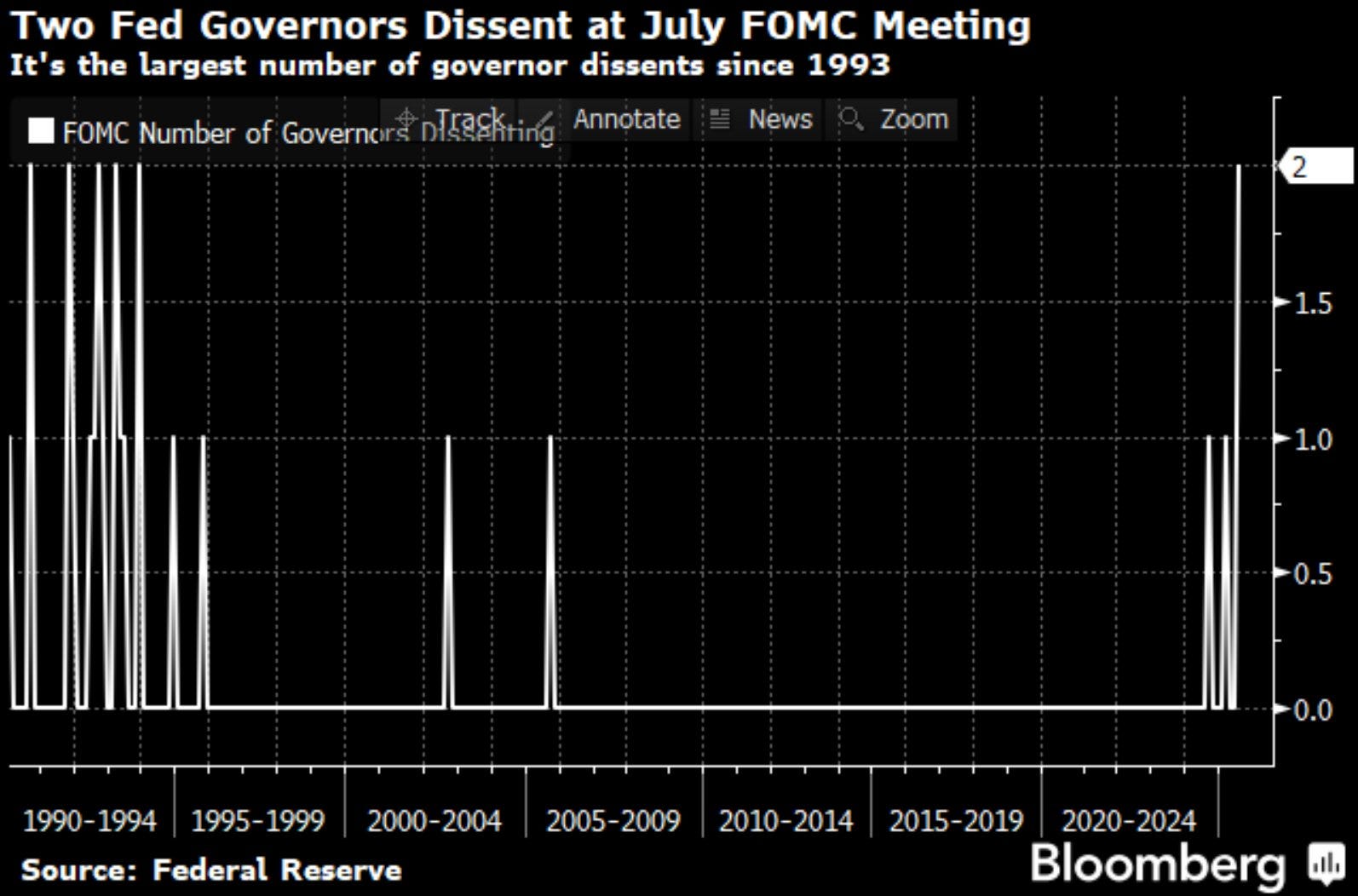 No FOMC, desde 1993, ou seja, há 32 anos, que não tínhamos 2 votos dissidentes na mesma votação: Michelle Bowman e Christopher Wallace votaram a favor de uma redução de 0,25%. O recado? O clima está mudando, e a pressão que era de fora pra dentro, agora começa a ser interna também.O comunicado do Fed também trouxe duas mudanças em relação à reunião anterior: