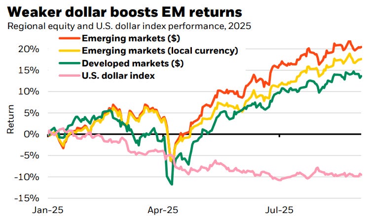 2025 tem sido um presentão para os mercados emergentes. A festa começa com o dólar mais fraco no mundo e continuou com as economias surpreendendo, cortando juros e crescendo de forma saudável. Resultado de todas essas variantes? Renda fixa emergente entregando quase o dobro do retorno dos Treasuries dos EUA YTD (9% vs. 4,5%) e o índice MSCI EM subindo 20%, bem acima dos 14% dos mercados desenvolvidos e do 12% do S&P500.