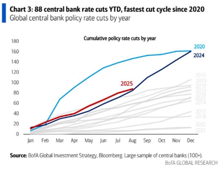 O Fed está prestes a cortar os juros novamente. Somente esse ano já houve 88 cortes de juros em todo o mundo no acumulado do ano, sendo esse o maior número desde 2020. Isso coloca 2025 no caminho para ser o 3° ciclo global de cortes mais rápido já registrado: