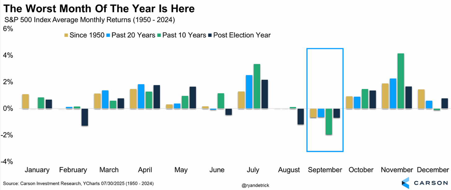 Agora, com o fim do verão no hemisfério norte, entramos em setembro que é o mês que carrega a fama de “vilão” do mercado. Estatisticamente, é o pior mês em termos de desempenho e volatilidade em várias janelas: desde 1950, nos últimos 10 anos, nos últimos 20… e ainda o 3º pior quando se trata de anos pós-eleitorais.